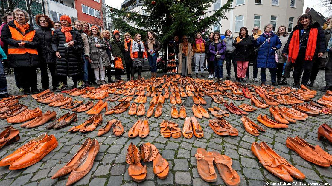 2024年11月25日德国科隆妇女权益团体展示橙色鞋,每双代表了被丈夫或男友杀害或未遂杀害的女性 图像来源: Martin Meissner/AP Photo/picture alliance